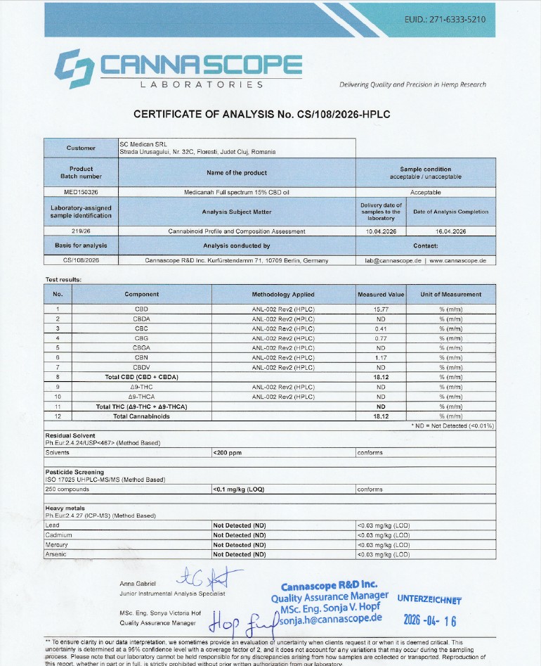 - Természetes Terpének: A Medicanah olajban lévő terpének azonosak azokkal, amelyek a nyers kender növényben találhatók, autentikus, kellemes ízt biztosítva és felerősítve a terápiás hatásokat.